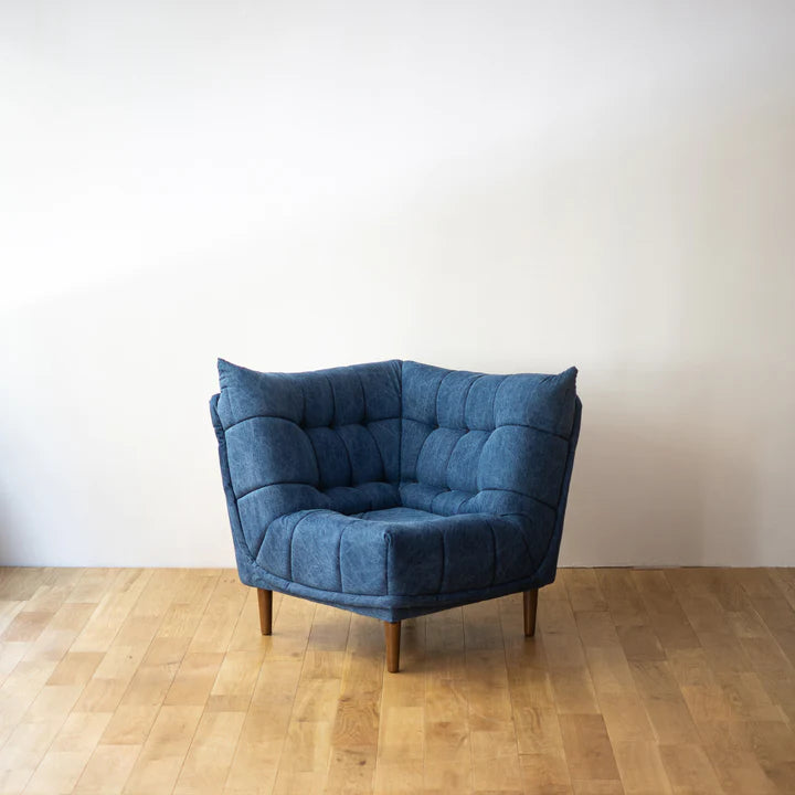 日本岡山縣由60年代起已開始生產牛仔布,使用了天然染料製作,以傳統織布機處理,因此布料的編織密度更高,令布質比起一般牛仔布更耐磨,故有一定的耐刮功用。另外梳化的外型設計以特厚的高密度乳膠配上格仔車線,讓整張梳化不容易變形,亦提高了整個梳化舒適度,有如包圍着自己。